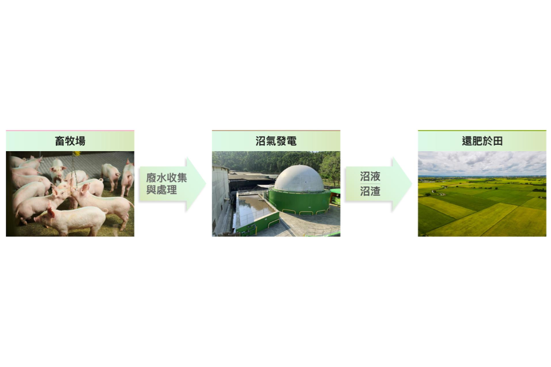 選址新合興示範牧場,完成養豬廢水集中與處理系統,設置沼氣發電,將沼液沼渣「還肥於田」;