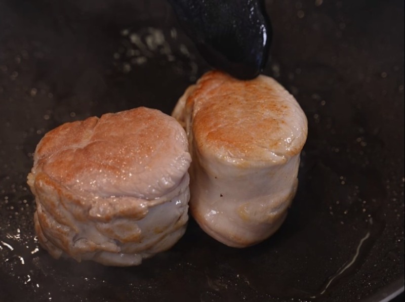 3.鍋中放油後,先將厚菲力六面煎上色。